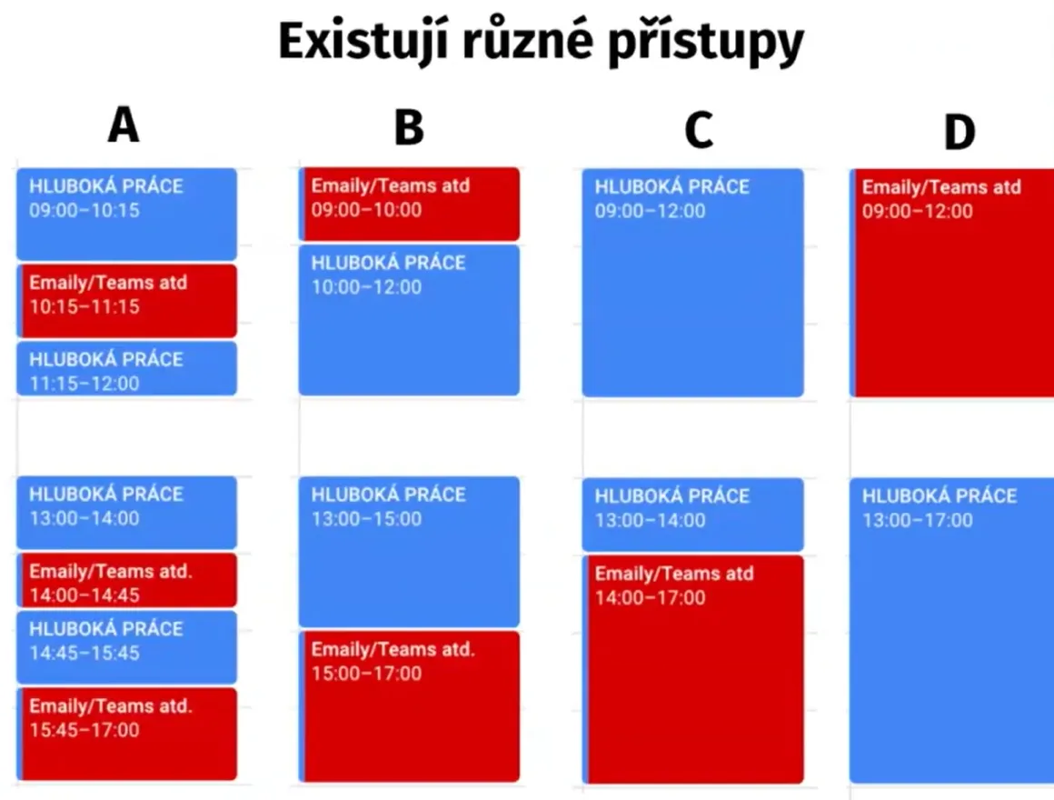 Realisticky to vidím spíš na „volná“ odpoledne/dopoledne. Na prvním obrázku níže nechcete, aby váš kalendář vypadal jako ve sloupečku vpravo. Z různých přístupů (obr. 2) je za mě hratelný D, případně B.